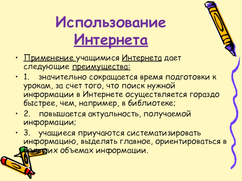 подготовки к урокам, за счет того, что поиск нужной информации в Интернете осуществляется гораздо быстрее, чем, например, в библиотеке;