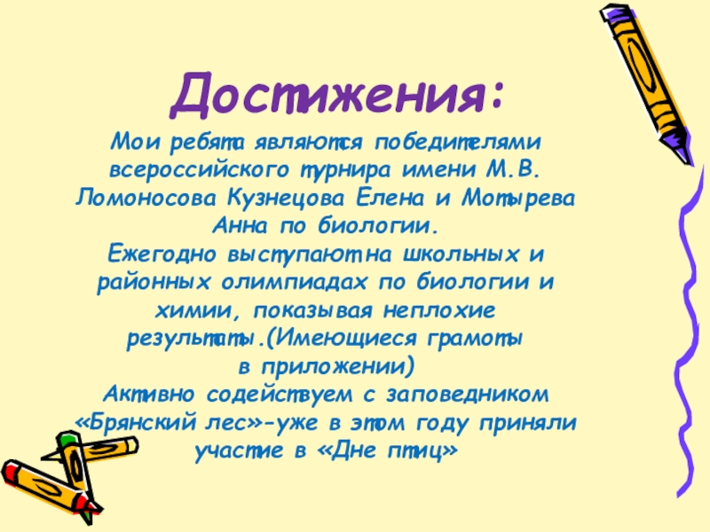 Ежегодно выступают на школьных и районных олимпиадах по биологии и химии, показывая неплохие результаты.(Имеющиеся грамоты