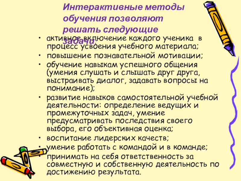 Интерактивные методы обучения позволяют решать следующие задачи: