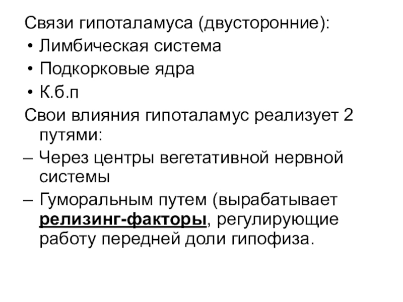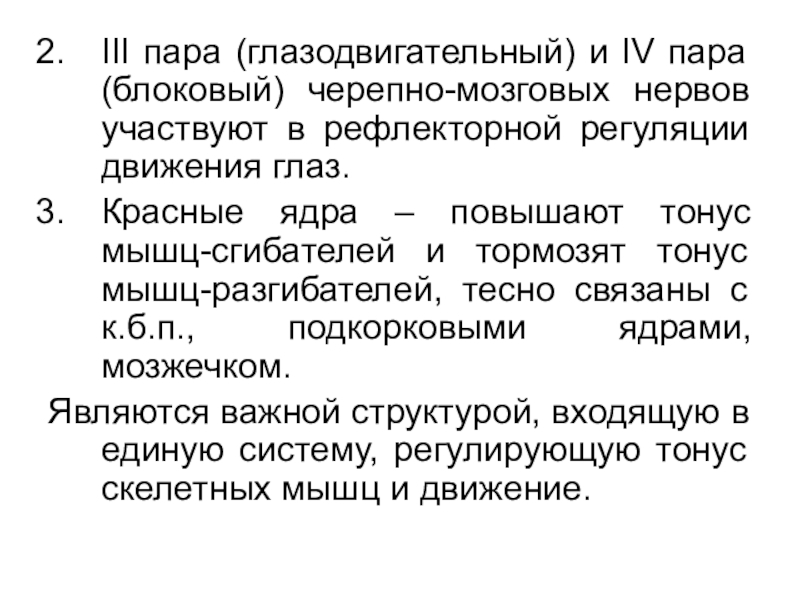 Красные ядра – повышают тонус мышц-сгибателей и тормозят тонус мышц-разгибателей, тесно связаны с к.б.п., подкорковыми ядрами, мозжечком.