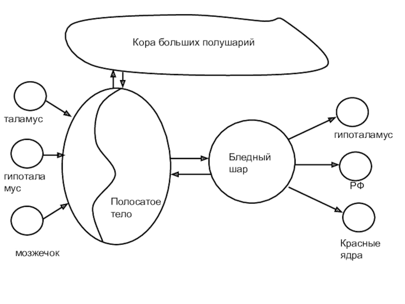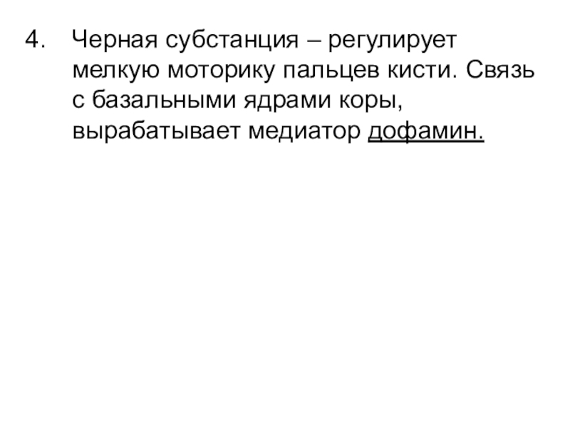Слайд 21Черная субстанция – регулирует мелкую моторику пальцев кисти. Связь с базальными
