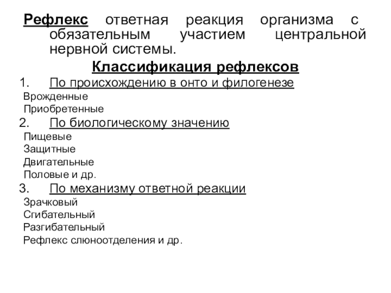 Слайд 10Рефлекс ответная реакция организма с обязательным участием центральной нервной системы.