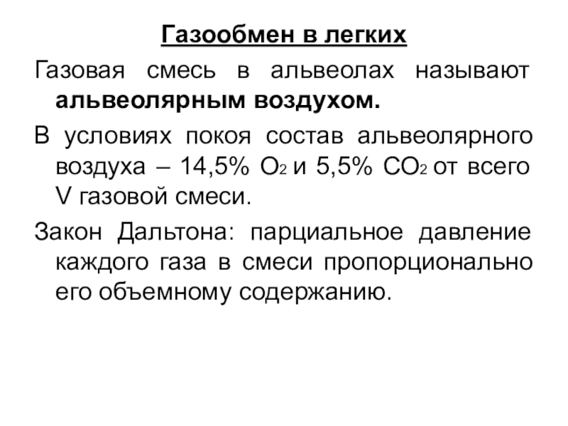 состав альвеолярного воздуха – 14,5% О2 и 5,5% СО2 от всего V газовой смеси.
