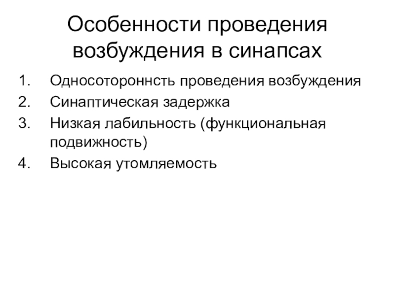 Слайд 9Особенности проведения возбуждения в синапсах