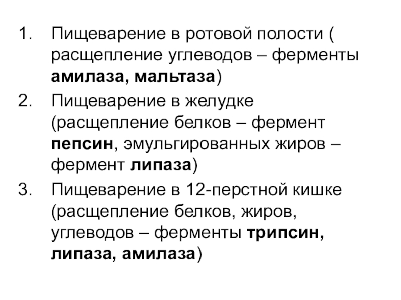 в желудке (расщепление белков – фермент пепсин, эмульгированных жиров – фермент липаза)