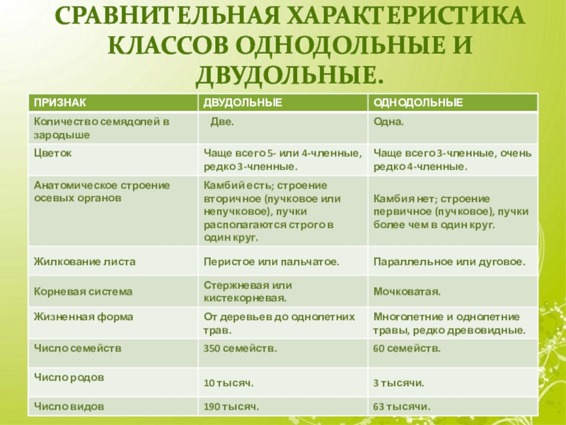 Сравнительная характеристика классов однодольные и двудольные.