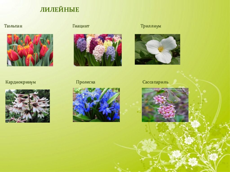 Семейство лилейные.1.Тюльпан2.Гиацинт3.Триллиум4. Сассапариль5. КардиокринумЛилейные многолетние травянистые луковичные растения.      Среди лилейных известно два эпифита. Это   родокодон ургинеевидный на острове Мадагаскар и   лилия древесная в Восточной Азии. Но и у них имеется луковица,  скрытая в моховом покрове ствола дерева.