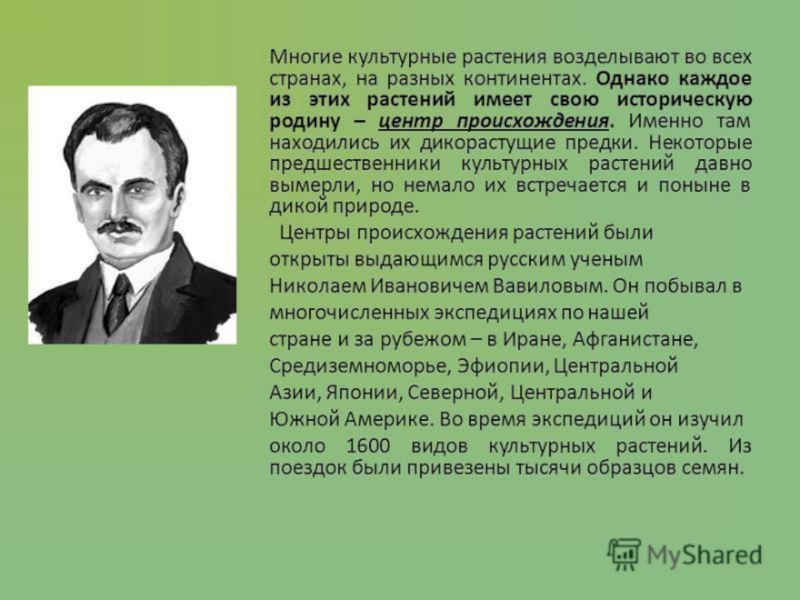 Н.И. Вавилов установил центры происхождения культурных растений, где находится наибольшее видовое и сортовое многообразие культурных растений.