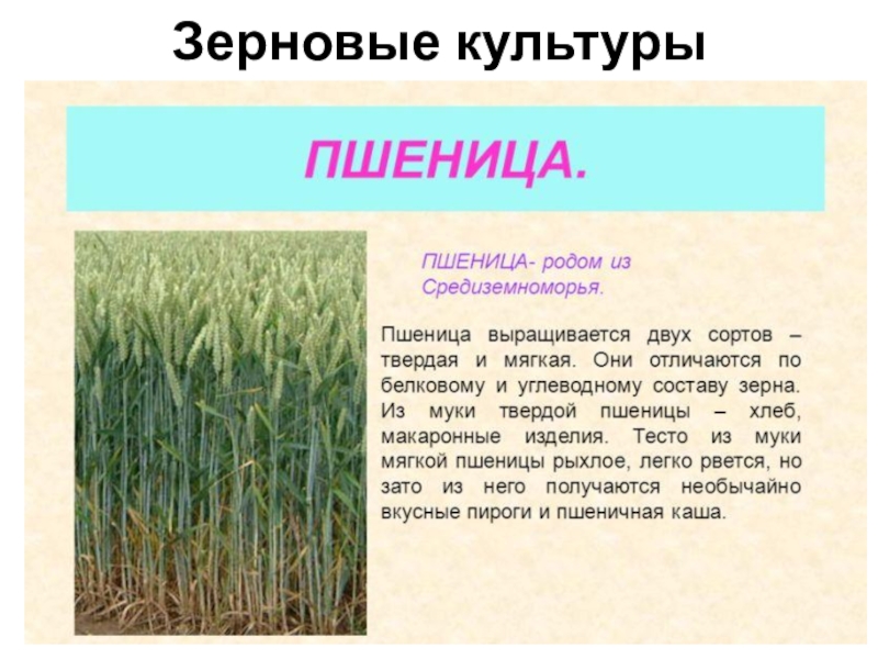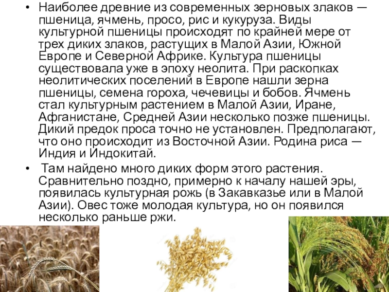 Слайд 9Наиболее древние из современных зерновых злаков — пшеница, ячмень, просо, рис