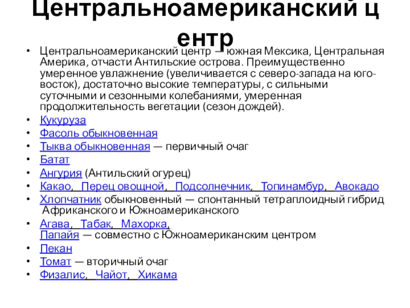 Центральноамериканский центр (примерно 10 %). (кукуруза, фасоль, тыква, какао, перец, подсолнечник, табак, топинамбур, папайя)