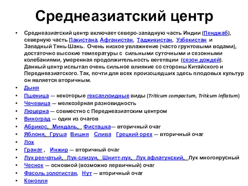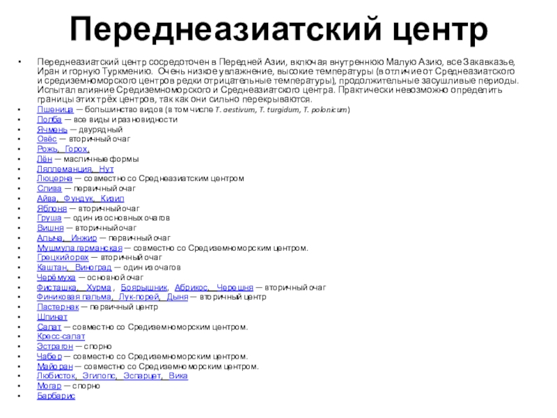 Юго-Западноазиатский центр (4 % культурных растений). (пшеница, ячмень, рожь, слива, фундук, финиковая пальма)