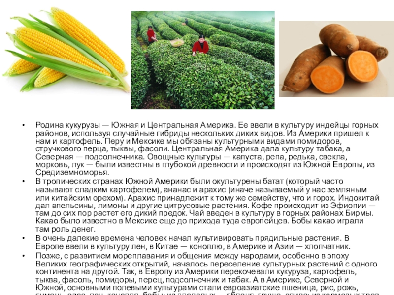 В тропических странах Южной Америки были окультурены батат (который часто называют сладким картофелем), ананас и арахис (иначе называемый у нас земляным или китайским орехом). Арахис принадлежит к тому же семейству, что и горох. Индокитай дал апельсины, лимоны и другие цитрусовые растения. Кофе происходит из Эфиопии — там до сих пор растет его дикий предок. Чай введен в культуру в горных районах Бирмы. Какао было известно в Мексике еще до прихода туда европейцев. Бобы какао играли там роль денег.