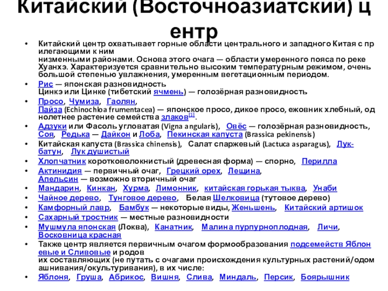 Восточноазиатский центр (20 % культурных растений). (просо, соя, редька, грецкий орех, мандарин, хурма, бамбук, женьшень)