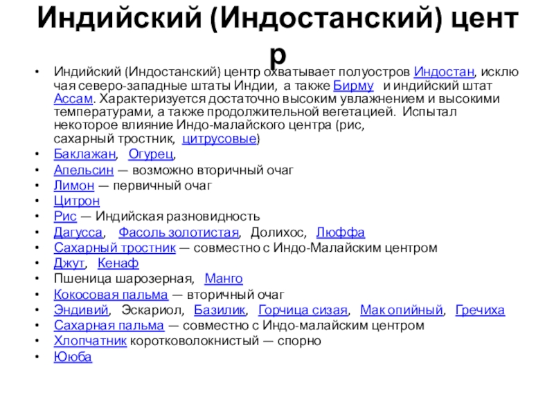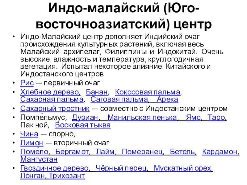 Южно-азиатский тропический центр (около 33 % от общего числа видов культурных растений). (огурец, лимон, джут, манго, рис, банан, кокосовая пальма, черный перец)