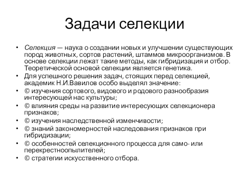сортов растений, штаммов микроорганизмов. В основе селекции лежат такие методы, как гибридизация и отбор. Теоретической основой селекции является генетика.