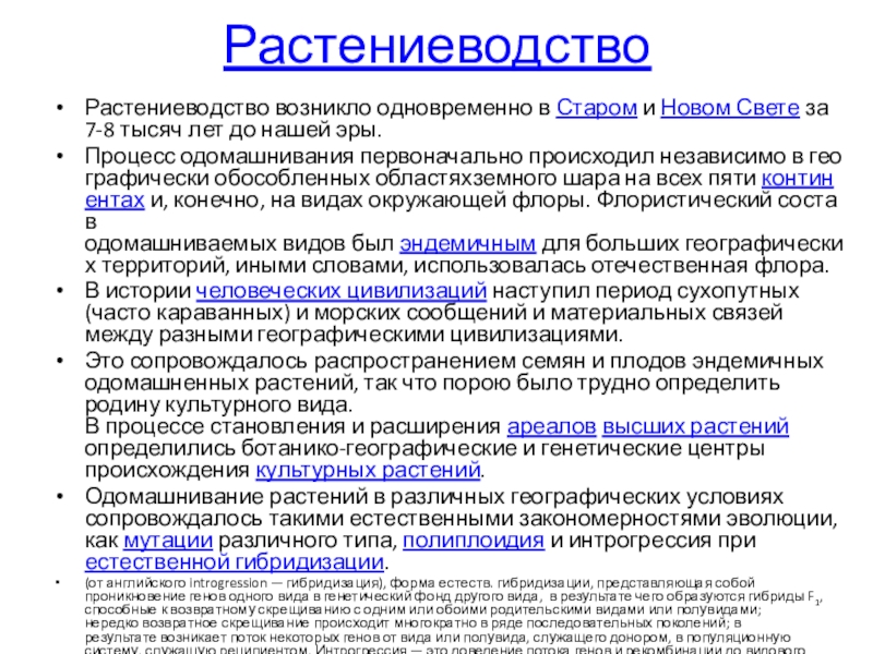 Это сопровождалось распространением семян и плодов эндемичных одомашненных растений, так что порою было трудно определить родину культурного вида. В процессе становления и расширения ареалов высших растений определились ботанико-географические и генетические центры происхождения культурных растений.