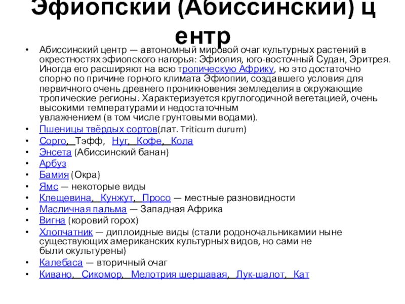 Абиссинский центр — автономный мировой очаг культурных растений в окрестностях эфиопского нагорья: Эфиопия, юго-восточный