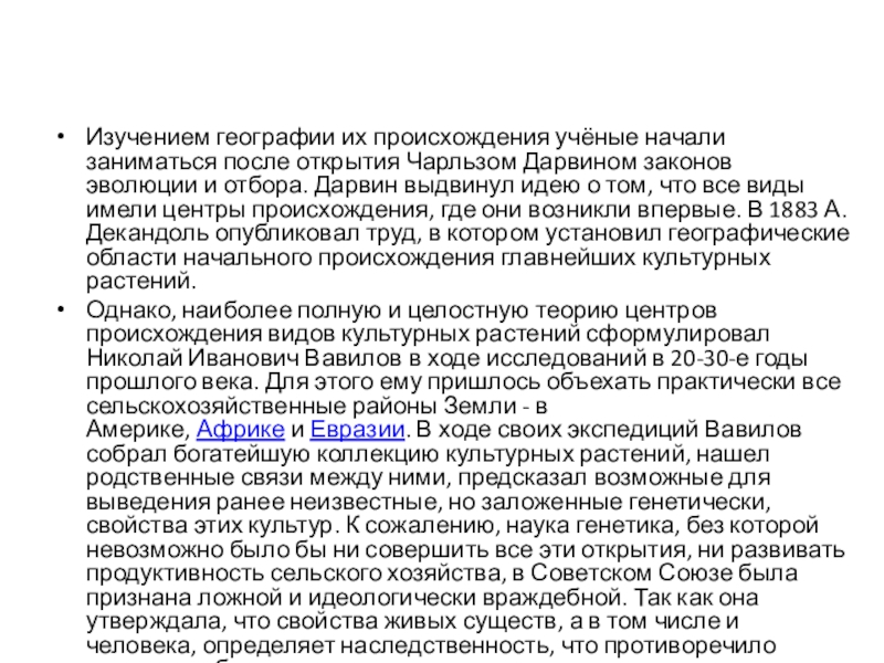законов эволюции и отбора. Дарвин выдвинул идею о том, что все виды имели центры происхождения, где они возникли впервые. В 1883 А. Декандоль опубликовал труд, в котором установил географические области начального происхождения главнейших культурных растений.