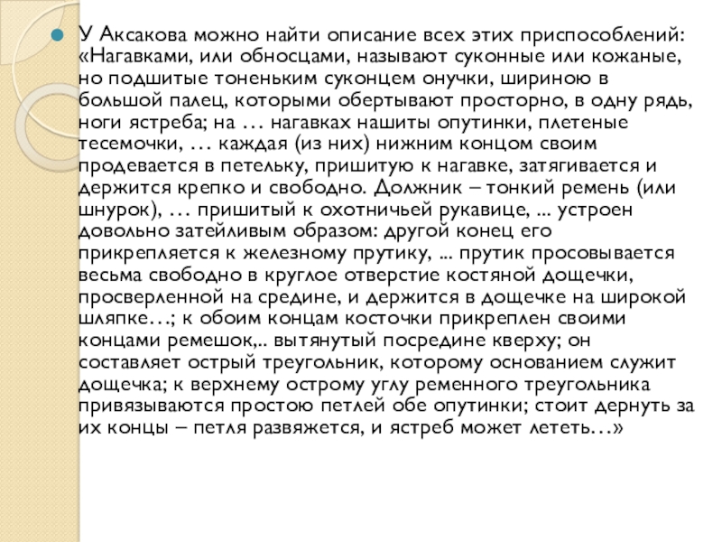Слайд 13У Аксакова можно найти описание всех этих приспособлений: «Нагавками, или обносцами,