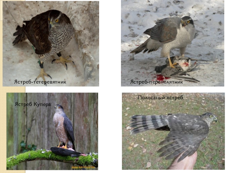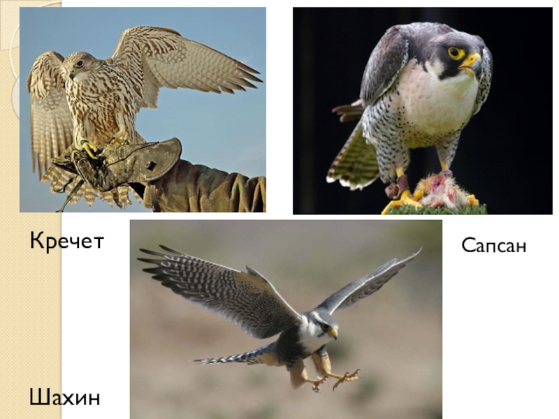 двух семейств отряда хищных птиц: из соколиных – это кречет, сапсан (сокол-утятник), шахин (индийский сокол), берберийский сокол (североафриканский), сокол балобан, средиземноморский сокол, восточноиндийский сокол, мексиканский сокол, дербник (сокол-голубятник) и обыкновенный чеглок; из ястребиных – это ястреб-тетеревятник, ястреб-перепелятник, ястреб Купера, полосатый ястреб и орлы – беркут, степной орел, ястребиный орел .