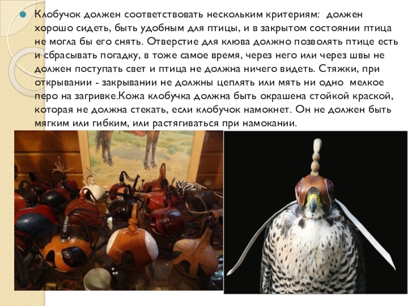 птицы, и в закрытом состоянии птица не могла бы его снять. Отверстие для клюва должно позволять птице есть и сбрасывать погадку, в тоже самое время, через него или через швы не должен поступать свет и птица не должна ничего видеть. Стяжки, при открывании - закрывании не должны цеплять или мять ни одно мелкое перо на загривке.Кожа клобучка должна быть окрашена стойкой краской, которая не должна стекать, если клобучок намокнет. Он не должен быть мягким или гибким, или растягиваться при намокании.