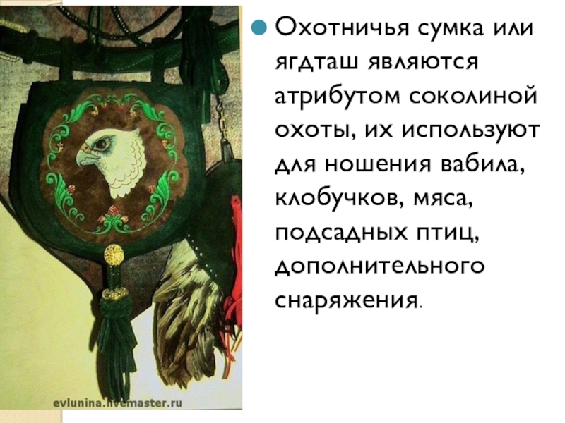 Слайд 18Охотничья сумка или ягдташ являются атрибутом соколиной охоты, их используют для