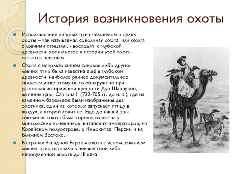 Охота с использованием соколов либо других ловчих птиц была известна ещё в глубокой древности; наиболее раннее документальное свидетельство этому было обнаружено при раскопках ассирийской крепости Дур-Шаррукин, вотчины царя Саргона II (722-705 гг. до н. э.), где на каменном барельефе были изображены два охотника, один из которых запускает птицу в воздух, а второй ловит её. Ещё до нашей эры соколиная охота была хорошо известна у монгольских кочевников, китайских императоров, на Корейском полуострове, в Индокитае, Персии и на Ближнем Востоке.