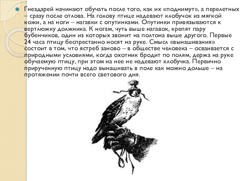 сразу после отлова. На голову птице надевают клобучок из мягкой кожи, а на ноги – нагавки с опутинками. Опутинки привязываются к вертлюжку должника. К ногам, чуть выше нагавок, крепят пару бубенчиков, один из которых звонит на полтона выше другого. Первые 24 часа птицу беспрестанно носят на руке. Смысл «вынашивания» состоит в том, что ястреб заново – в обществе человека – осваивается с природными условиями, когда охотник бродит по полям, держа на руке обучаемую птицу, при этом на нее не надевают клобучка. Первично прирученную птицу надо вынашивать в поле как можно дольше – на протяжении почти всего светового дня.