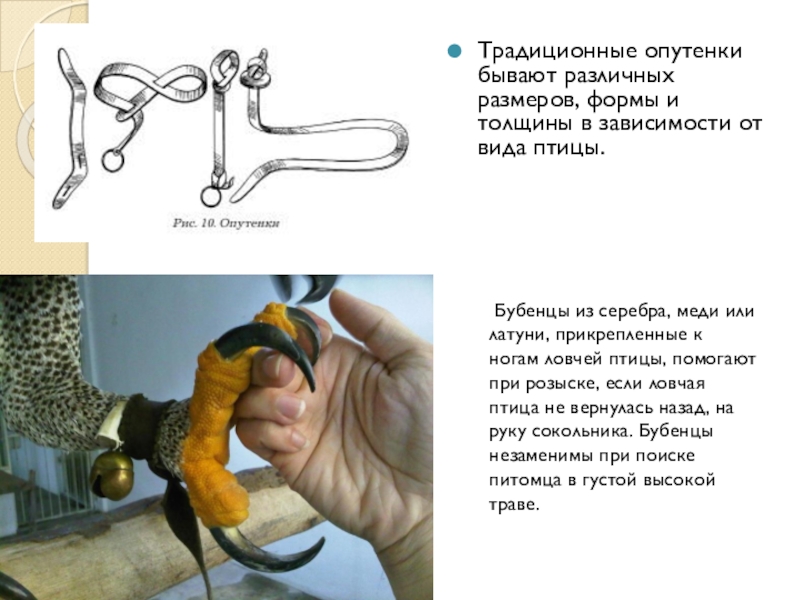 называют суконные или кожаные, но подшитые тоненьким суконцем онучки, шириною в большой палец, которыми обертывают просторно, в одну рядь, ноги ястреба; на … нагавках нашиты опутинки, плетеные тесемочки, … каждая (из них) нижним концом своим продевается в петельку, пришитую к нагавке, затягивается и держится крепко и свободно. Должник – тонкий ремень (или шнурок), … пришитый к охотничьей рукавице, ... устроен довольно затейливым образом: другой конец его прикрепляется к железному прутику, ... прутик просовывается весьма свободно в круглое отверстие костяной дощечки, просверленной на средине, и держится в дощечке на широкой шляпке…; к обоим концам косточки прикреплен своими концами ремешок,.. вытянутый посредине кверху; он составляет острый треугольник, которому основанием служит дощечка; к верхнему острому углу ременного треугольника привязываются простою петлей обе опутинки; стоит дернуть за их концы – петля развяжется, и ястреб может лететь…»