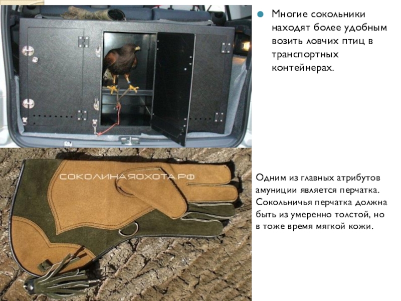 Слайд 14Многие сокольники находят более удобным возить ловчих птиц в транспортных контейнерах.