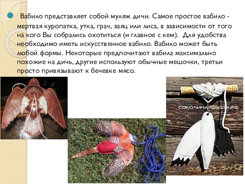 Слайд 17 Вабило представляет собой муляж дичи. Самое простое вабило - мертвая