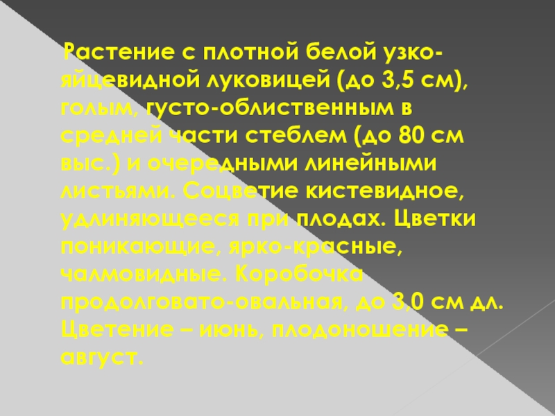 Растение с плотной белой узко-яйцевидной луковицей (до 3,5 см),