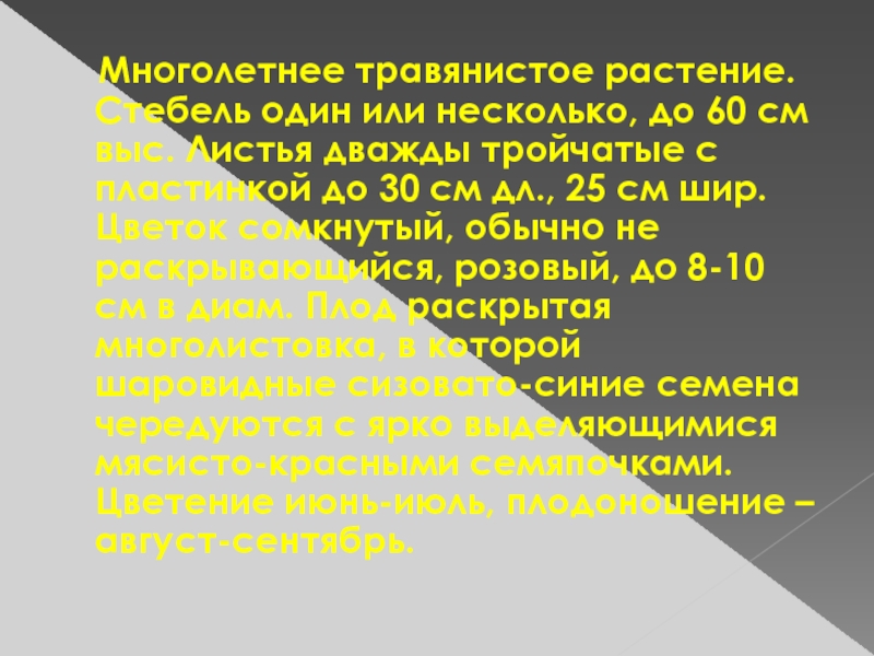 см выс. Листья дважды тройчатые с пластинкой до 30 см дл., 25 см шир. Цветок сомкнутый, обычно не раскрывающийся, розовый, до 8-10 см в диам. Плод раскрытая многолистовка, в которой шаровидные сизовато-синие семена чередуются с ярко выделяющимися мясисто-красными семяпочками. Цветение июнь-июль, плодоношение – август-сентябрь.