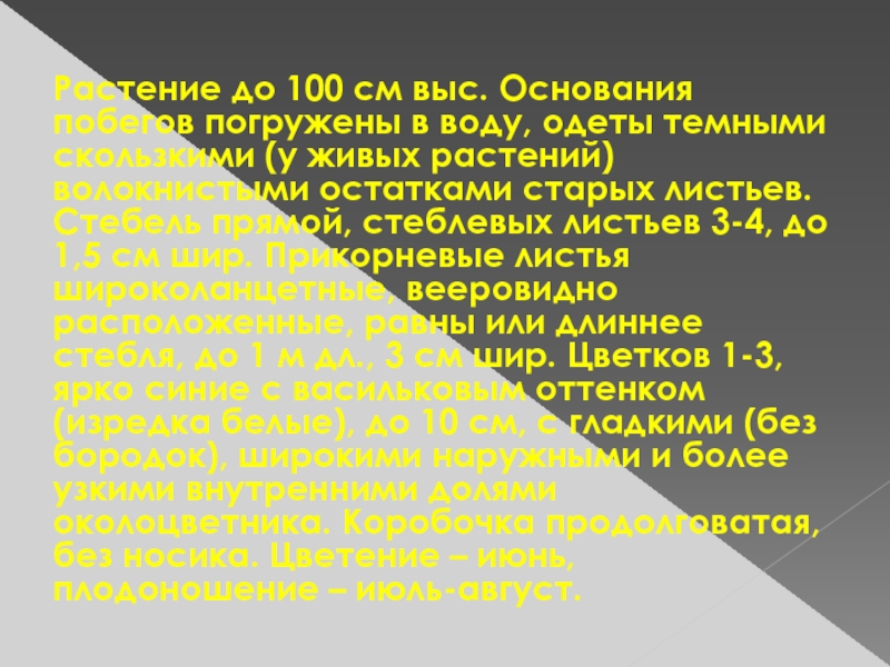 темными скользкими (у живых растений) волокнистыми остатками старых листьев. Стебель прямой, стеблевых листьев 3-4, до 1,5 см шир. Прикорневые листья широколанцетные, вееровидно расположенные, равны или длиннее стебля, до 1 м дл., 3 см шир. Цветков 1-3, ярко синие с васильковым оттенком (изредка белые), до 10 см, с гладкими (без бородок), широкими наружными и более узкими внутренними долями околоцветника. Коробочка продолговатая, без носика. Цветение – июнь, плодоношение – июль-август.
