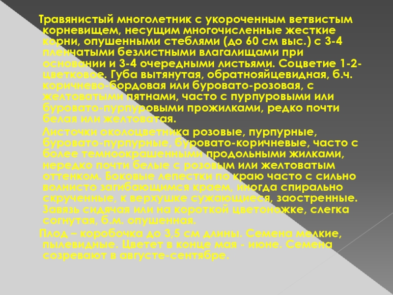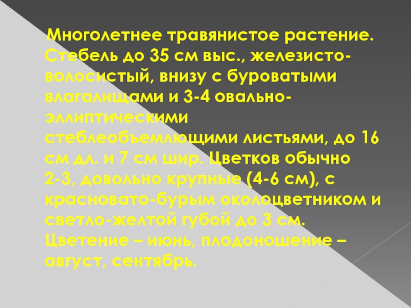 внизу с буроватыми влагалищами и 3-4 овально-эллиптическими стеблеобъемлющими листьями, до 16 см дл. и 7 см шир. Цветков обычно 2-3, довольно крупные (4-6 см), с красновато-бурым околоцветником и светло-желтой губой до 3 см. Цветение – июнь, плодоношение – август, сентябрь.