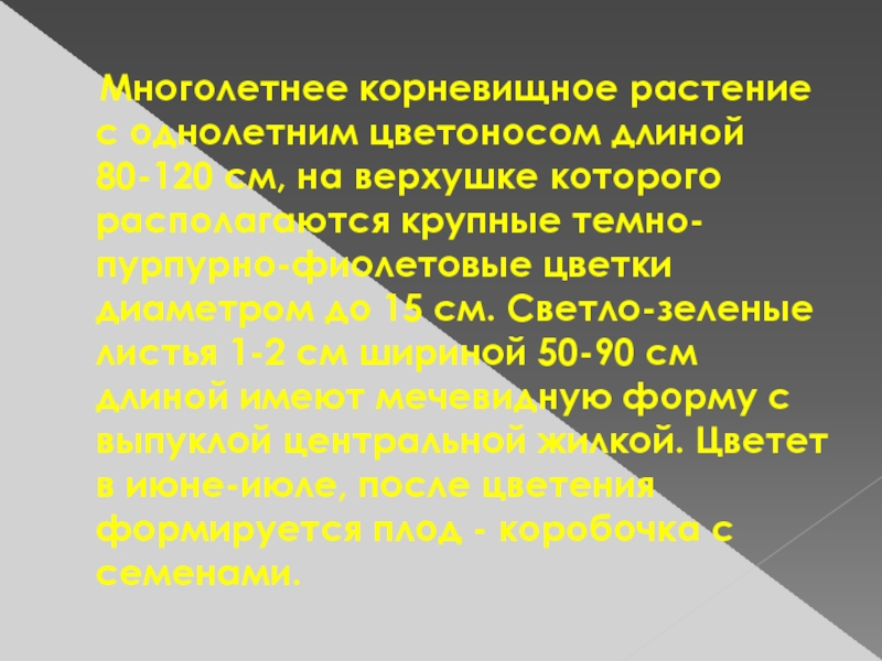 на верхушке которого располагаются крупные темно-пурпурно-фиолетовые цветки диаметром до 15 см. Светло-зеленые листья 1-2 см шириной 50-90 см длиной имеют мечевидную форму с выпуклой центральной жилкой. Цветет в июне-июле, после цветения формируется плод - коробочка с семенами.