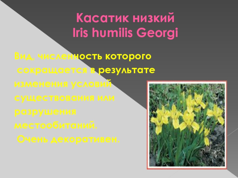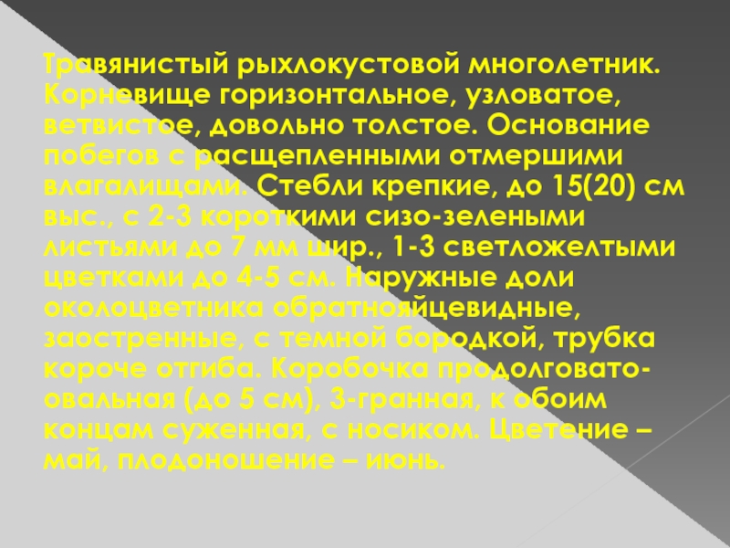 с расщепленными отмершими влагалищами. Стебли крепкие, до 15(20) см выс., с 2-3 короткими сизо-зелеными листьями до 7 мм шир., 1-3 светложелтыми цветками до 4-5 см. Наружные доли околоцветника обратнояйцевидные, заостренные, с темной бородкой, трубка короче отгиба. Коробочка продолговато-овальная (до 5 см), 3-гранная, к обоим концам суженная, с носиком. Цветение – май, плодоношение – июнь.