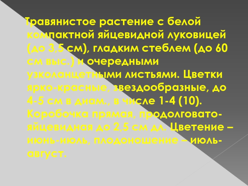 см), гладким стеблем (до 60 см выс.) и очередными узколанцетными листьями. Цветки ярко-красные, звездообразные, до 4-5 см в диам., в числе 1-4 (10). Коробочка прямая, продолговато-яйцевидная до 2,5 см дл. Цветение – июнь-июль, плодоношение – июль-август.