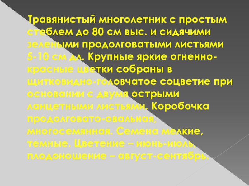 и сидячими зелеными продолговатыми листьями 5-10 см дл. Крупные яркие огненно-красные цветки собраны в щитковидно-головчатое соцветие при основании с двумя острыми ланцетными листьями. Коробочка продолговато-овальная, многосемянная. Семена мелкие, темные. Цветение – июнь-июль, плодоношение – август-сентябрь.