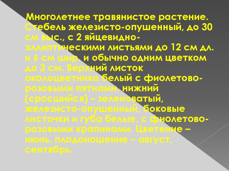 с 2 яйцевидно-эллиптическими листьями до 12 см дл. и 6 см шир. и обычно одним цветком до 3 см. Верхний листок околоцветника белый с фиолетово-розовыми пятнами, нижний (сросшийся) – зеленоватый, железисто-опушенный, боковые листочки и губа белые, с фиолетово-розовыми крапинами. Цветение – июнь, плодоношение – август, сентябрь.