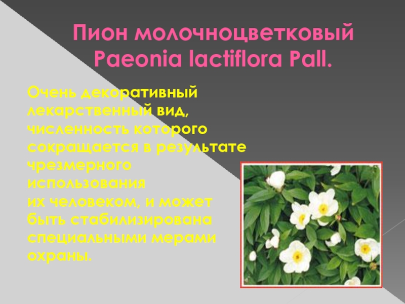голыми бороздчатыми стеблями до 80-100 см выс. Листья дважды перисто- или тройчато-рассеченные с пластинкой до 30 см дл., 30 см и шир., жестковатые. Конечные доли продолговатые, на верхушке заостренные, в основании клиновидно суженные. Цветы крупные, до 15-20 см в диам., молочно-белые или бледно-розовые. Листовки толстостенные, кожисто-мясистые, снаружи голые; осенью яркие. Цветение – конец мая - июнь, плодоношение – август-сентябрь.