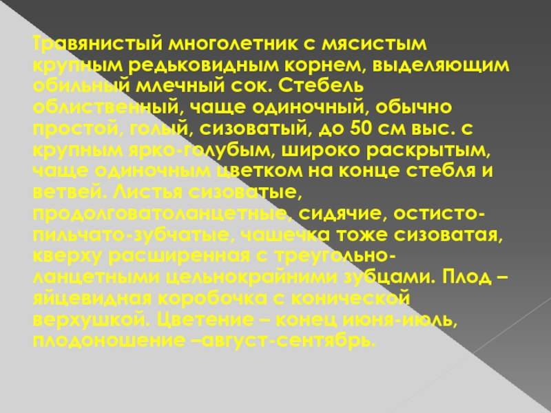 Травянистый многолетник с мясистым крупным редьковидным корнем, выделяющим обильный млечный сок.