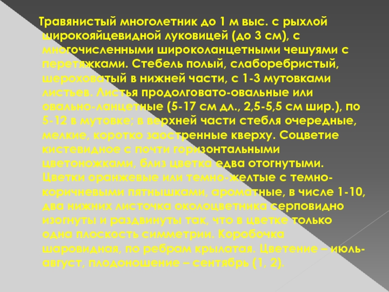 луковицей (до 3 см), с многочисленными широколанцетными чешуями с перетяжками. Стебель полый, слаборебристый, шероховатый в нижней части, с 1-3 мутовками листьев. Листья продолговато-овальные или овально-ланцетные (5-17 см дл., 2,5-5,5 см шир.), по 5-12 в мутовке; в верхней части стебля очередные, мелкие, коротко заостренные кверху. Соцветие кистевидное с почти горизонтальными цветоножками, близ цветка едва отогнутыми. Цветки оранжевые или темно-желтые с темно-коричневыми пятнышками, ароматные, в числе 1-10, два нижних листочка околоцветника серповидно изогнуты и раздвинуты так, что в цветке только одна плоскость симметрии. Коробочка шаровидная, по ребрам крылатая. Цветение – июль-август, плодоношение – сентябрь (1, 2).