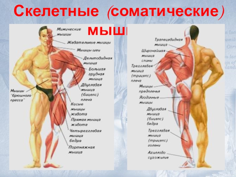 Это мышцы головы, туловища, конечностей, языка, гортани и др.