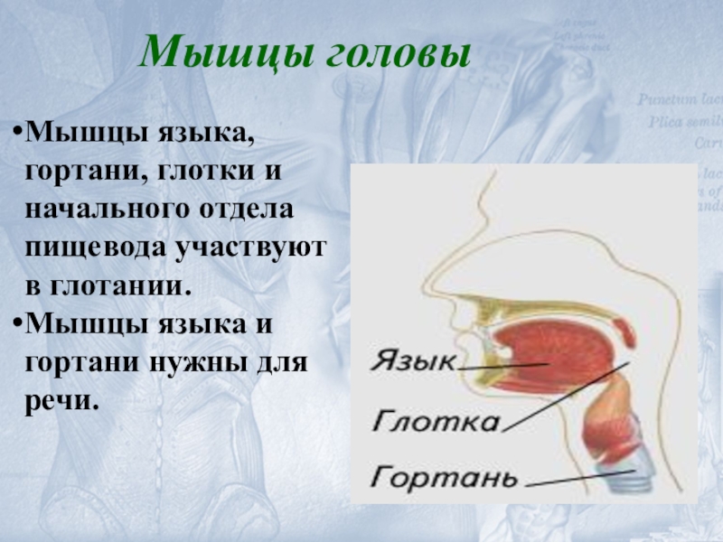 Слайд 37Мышцы языка, гортани, глотки и начального отдела пищевода участвуют в глотании.