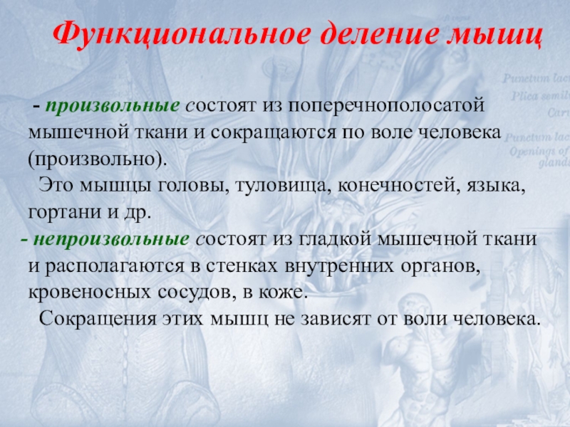 непроизвольные состоят из гладкой мышечной ткани и располагаются в стенках внутренних органов, кровеносных сосудов, в коже.