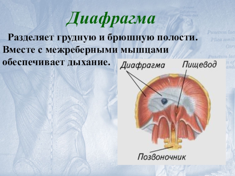 Слайд 38 Разделяет грудную и брюшную полости. Вместе с межреберными мышцами обеспечивает