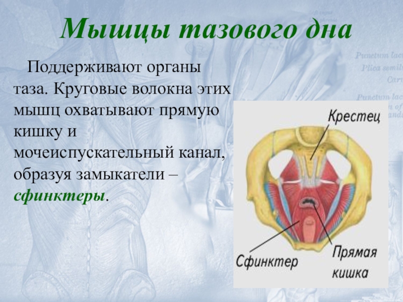 охватывают прямую кишку и мочеиспускательный канал, образуя замыкатели – сфинктеры.
