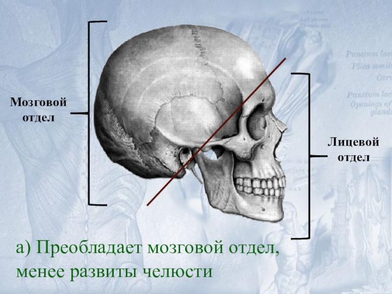 а) Преобладает мозговой отдел, менее развиты челюсти