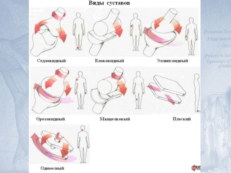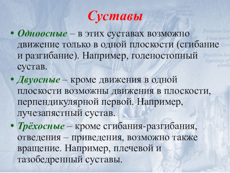 Двуосные – кроме движения в одной плоскости возможны движения в плоскости, перпендикулярной первой. Например, лучезапястный сустав.